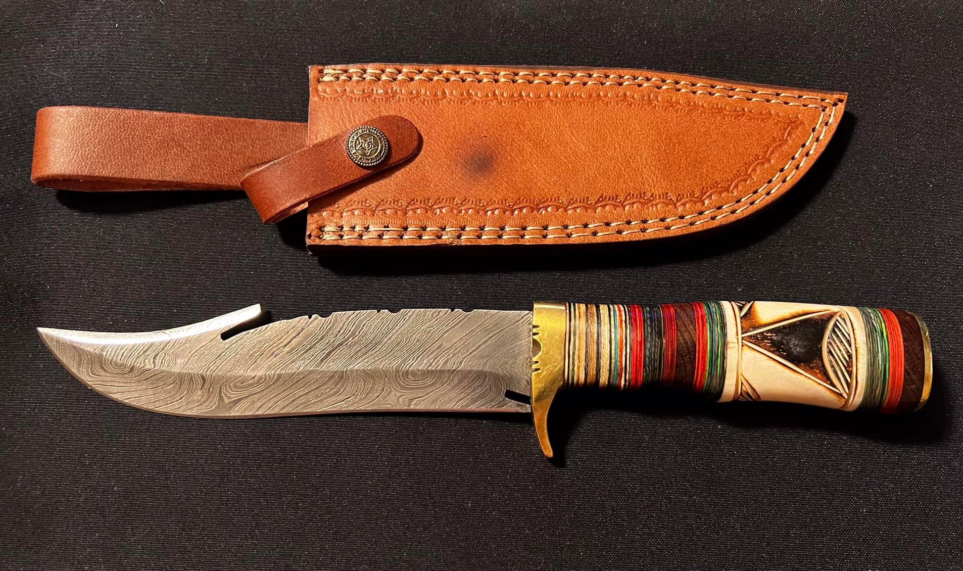 Cuchillo Grande en Acero Damasco, 12 pulgadas largo total, Mango de Hueso de Camello.