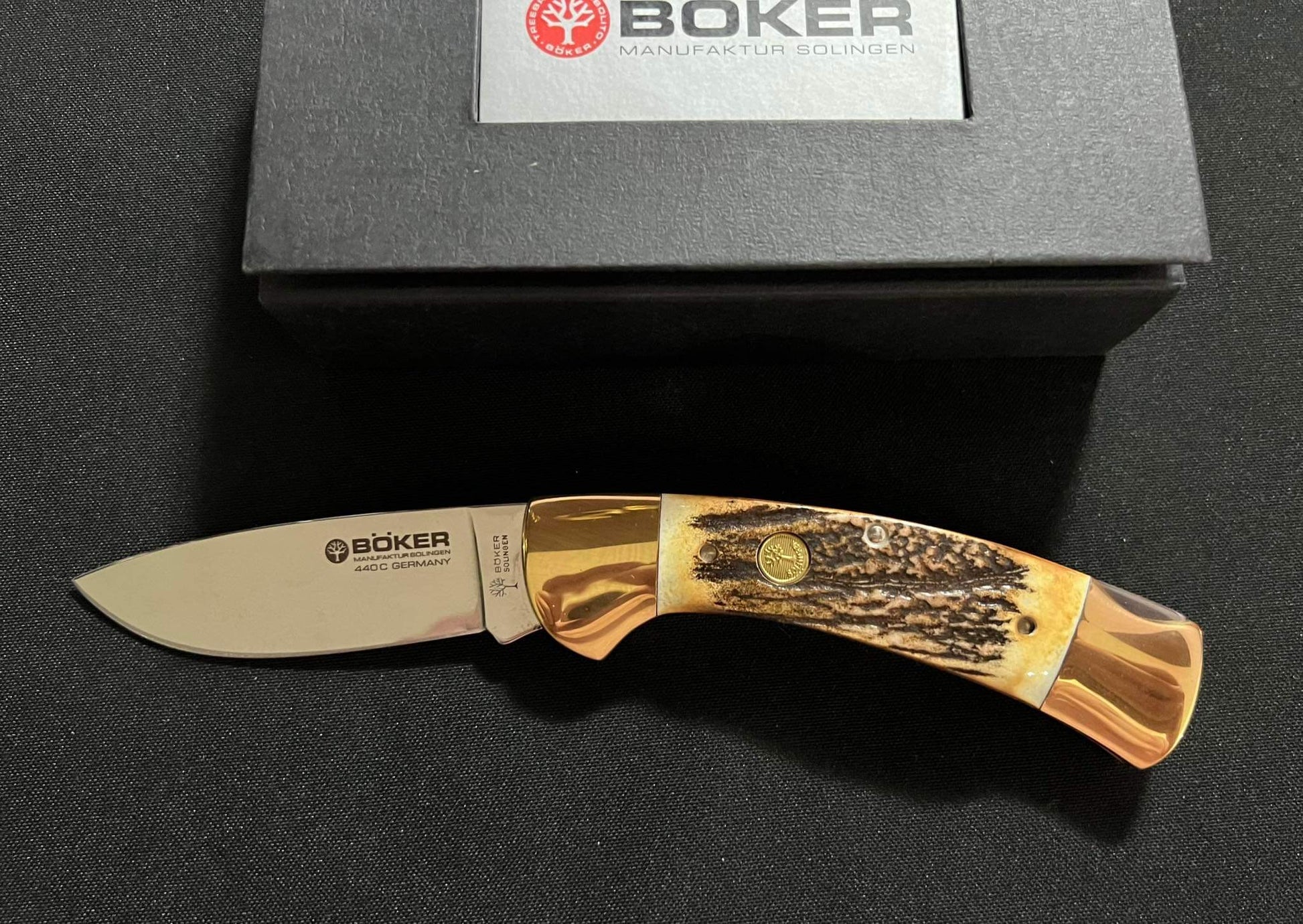 Navaja Boker 4000, Hecha en Solingen Alemania, 8 pulgadas largo total, Cachas de Asta de Ciervo, Incluye Funda de Piel, nueva en caja.