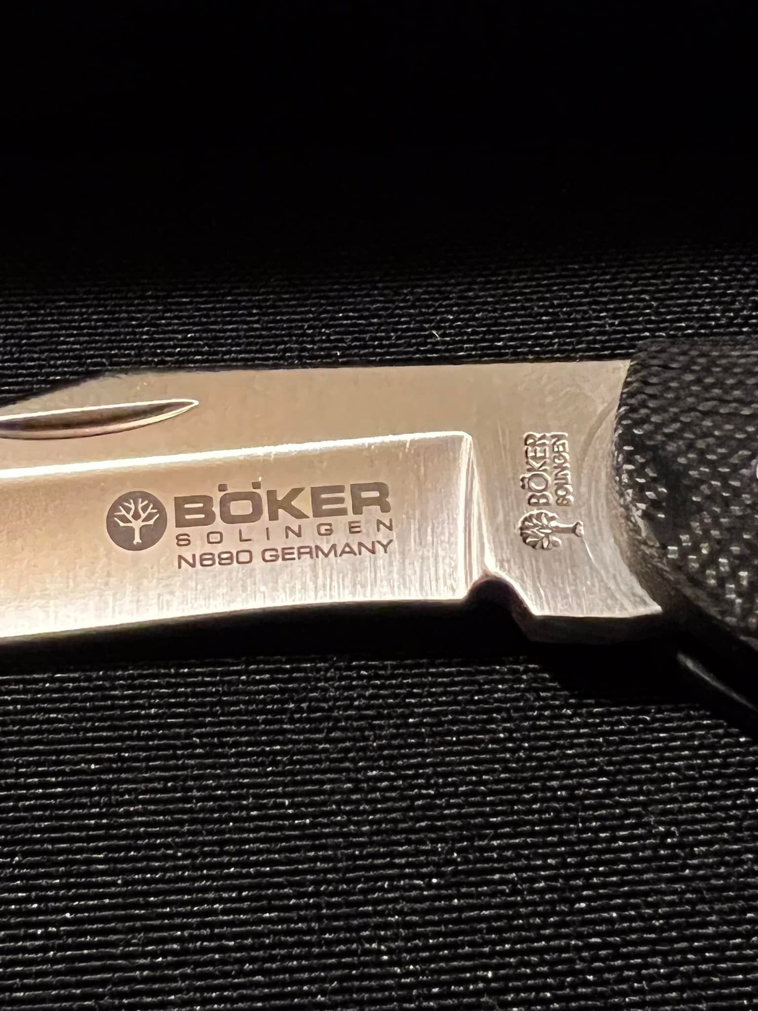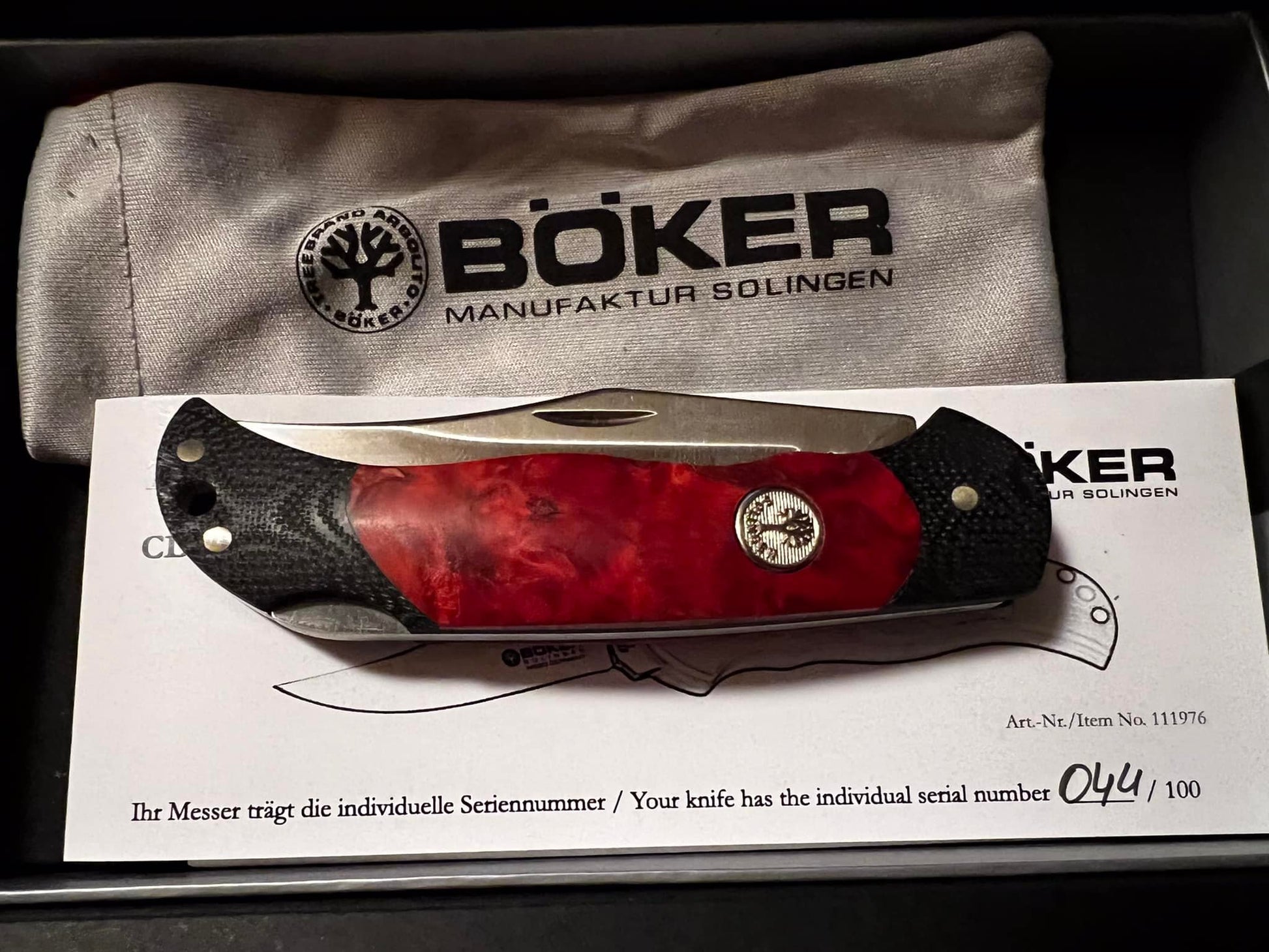 Navaja Boker CDC Schuchbauer, Junior Scout, 6.2 pulgadas largo total, Hecha en Solingen Alemania, 1 de 100 unidades, Serie 44, Cachas de Abedul Rizado, Bolsters de G10, Acero N690, Nueva en Caja.