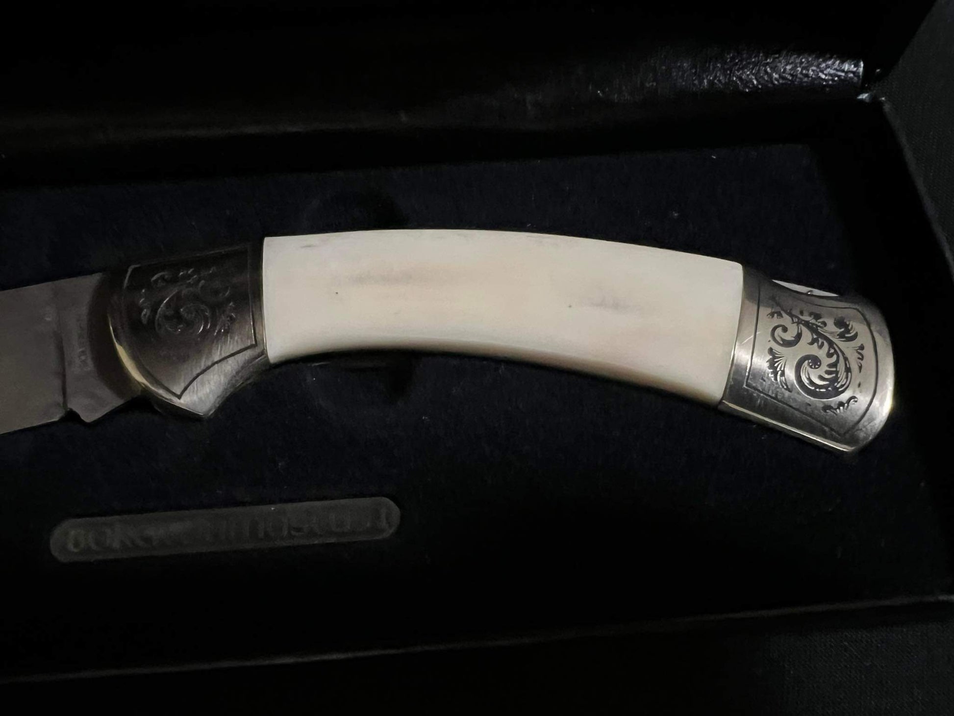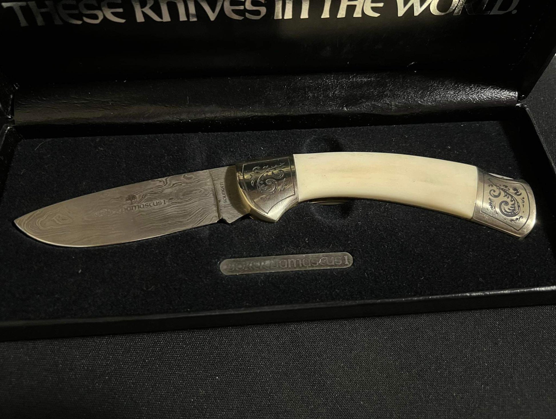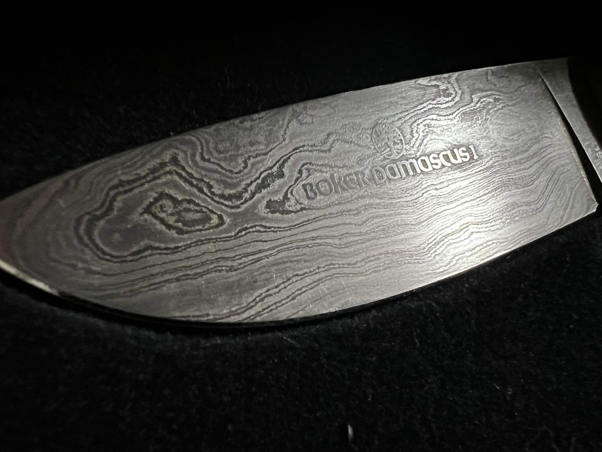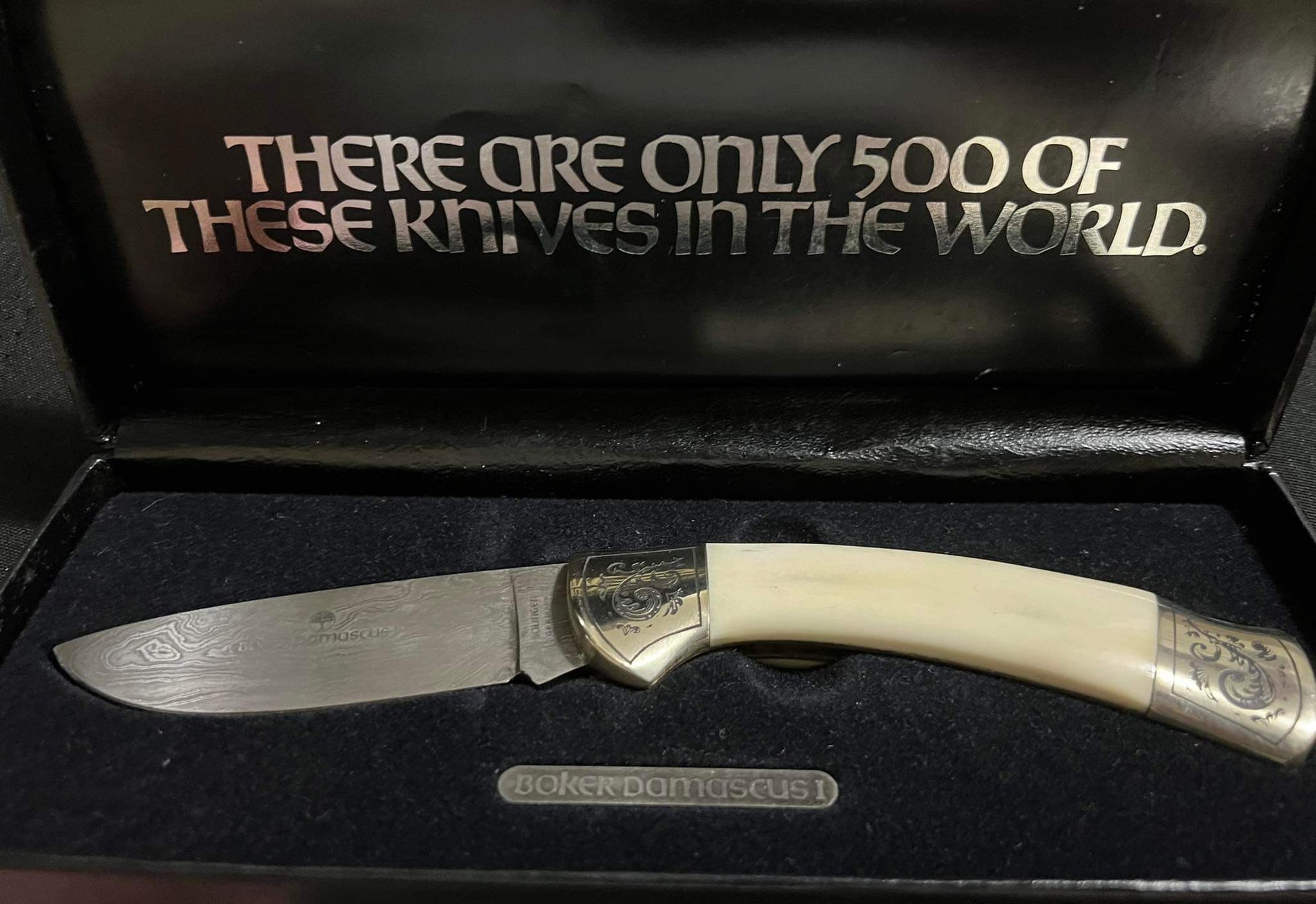 Navaja Boker en Acero Damasco, Cachas de Hueso, 8 Pulgadas Largo Total, Hecha en Solingen Alemania, Solo se Fabricaron 500 Unidades, nueva en caja.