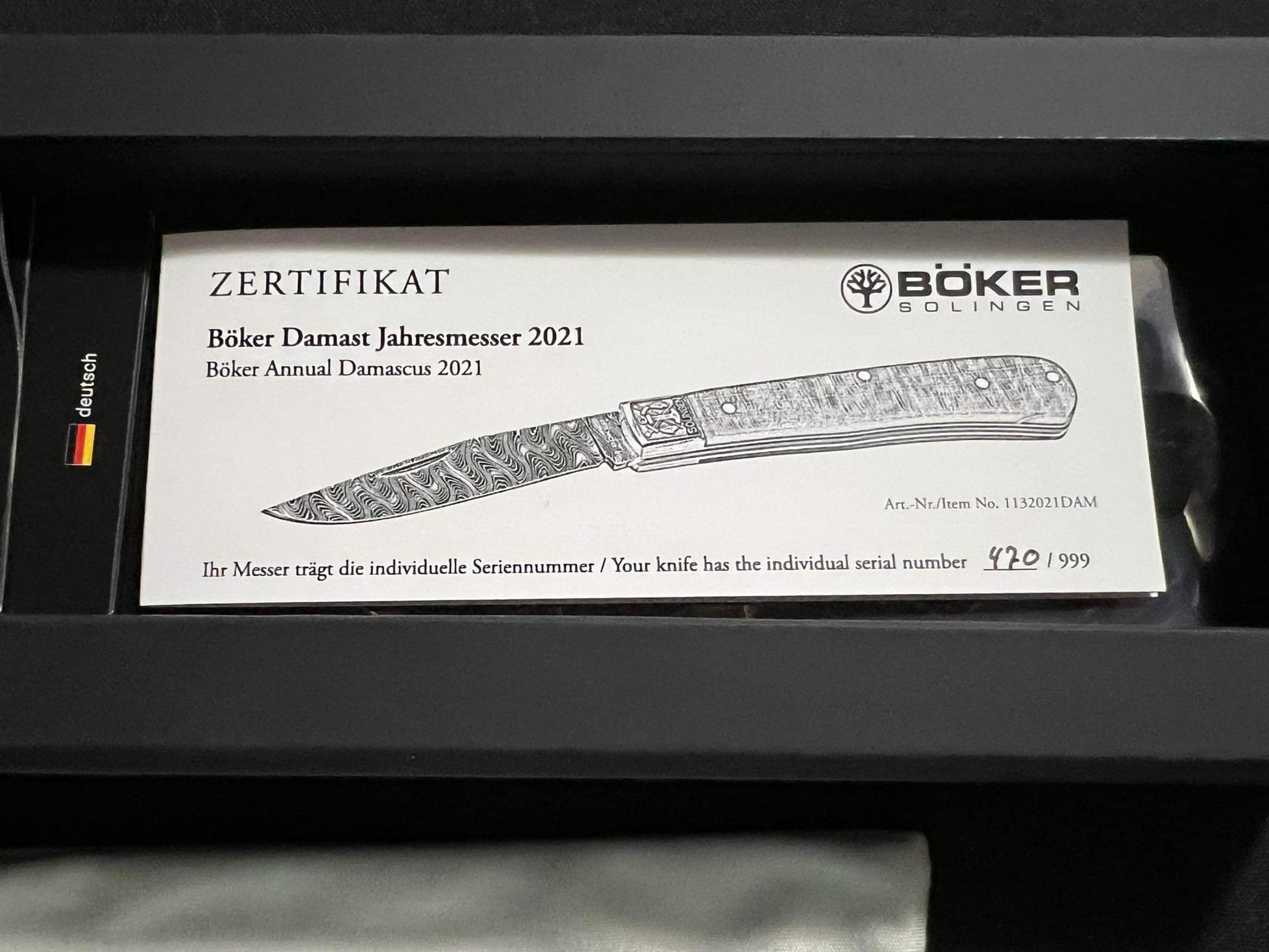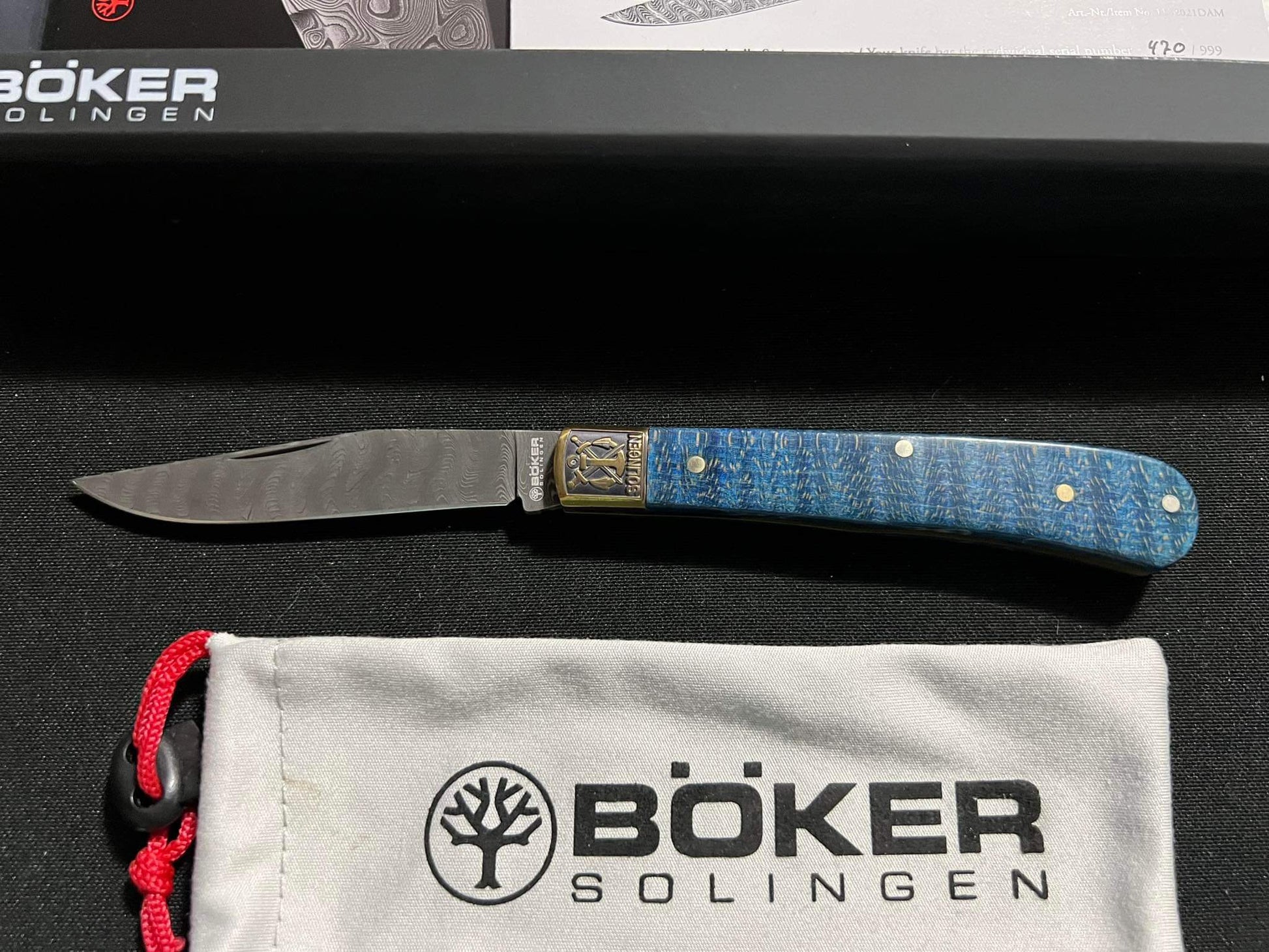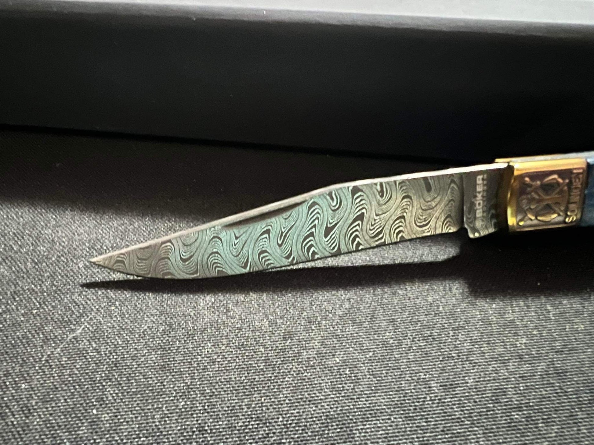 Navaja Boker en Acero Damasco, Edición Anual 2021, Hecha en Solingen Alemania, Cachas De Maple, 7.5 pulgadas largo total, nueva en caja.
