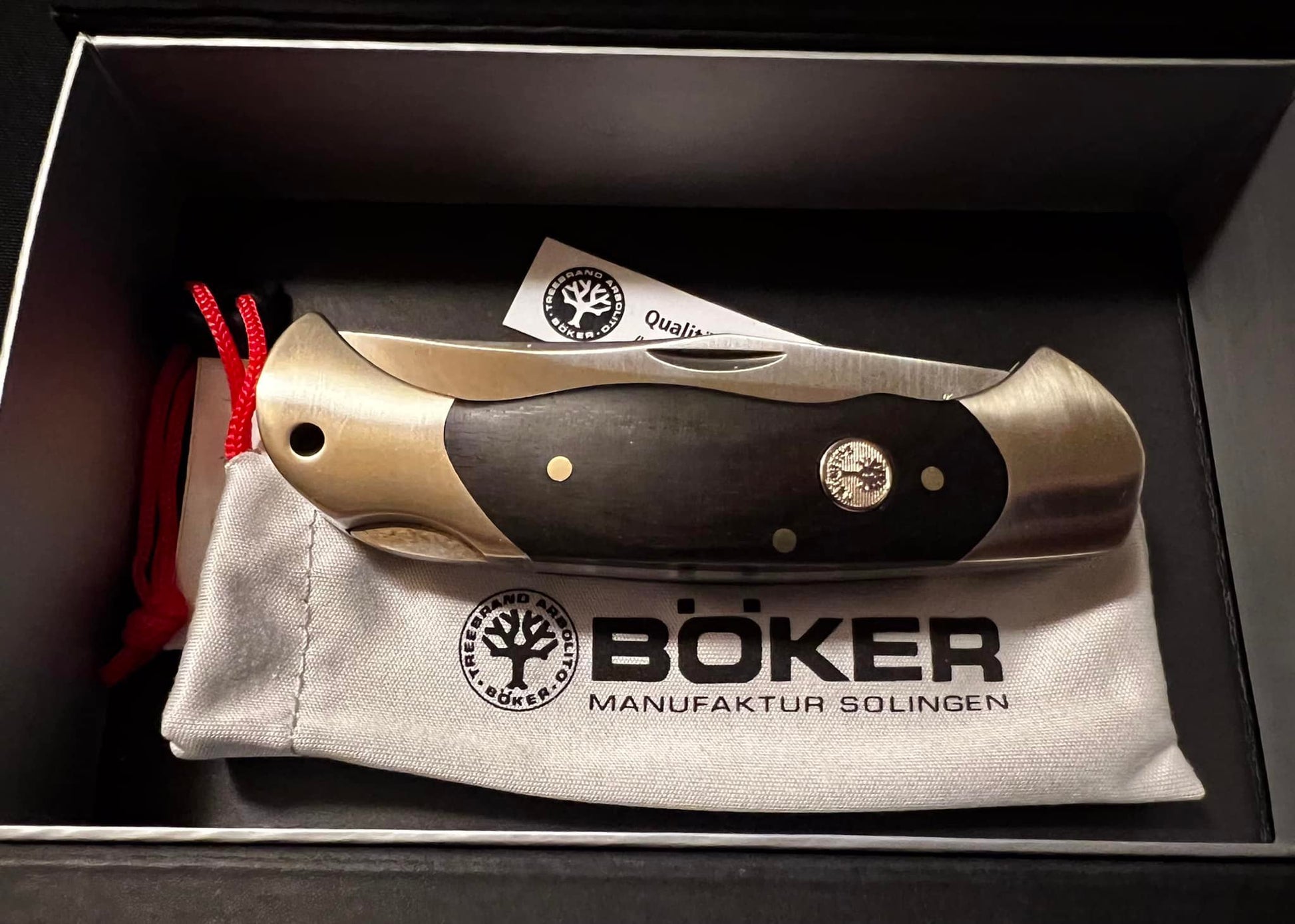 Navaja Böker Scout, 7.2 pulgadas largo total, Hecha en Solingen Alemania, Acero Cronidur, Cachas de Grenadill, nueva en caja.
