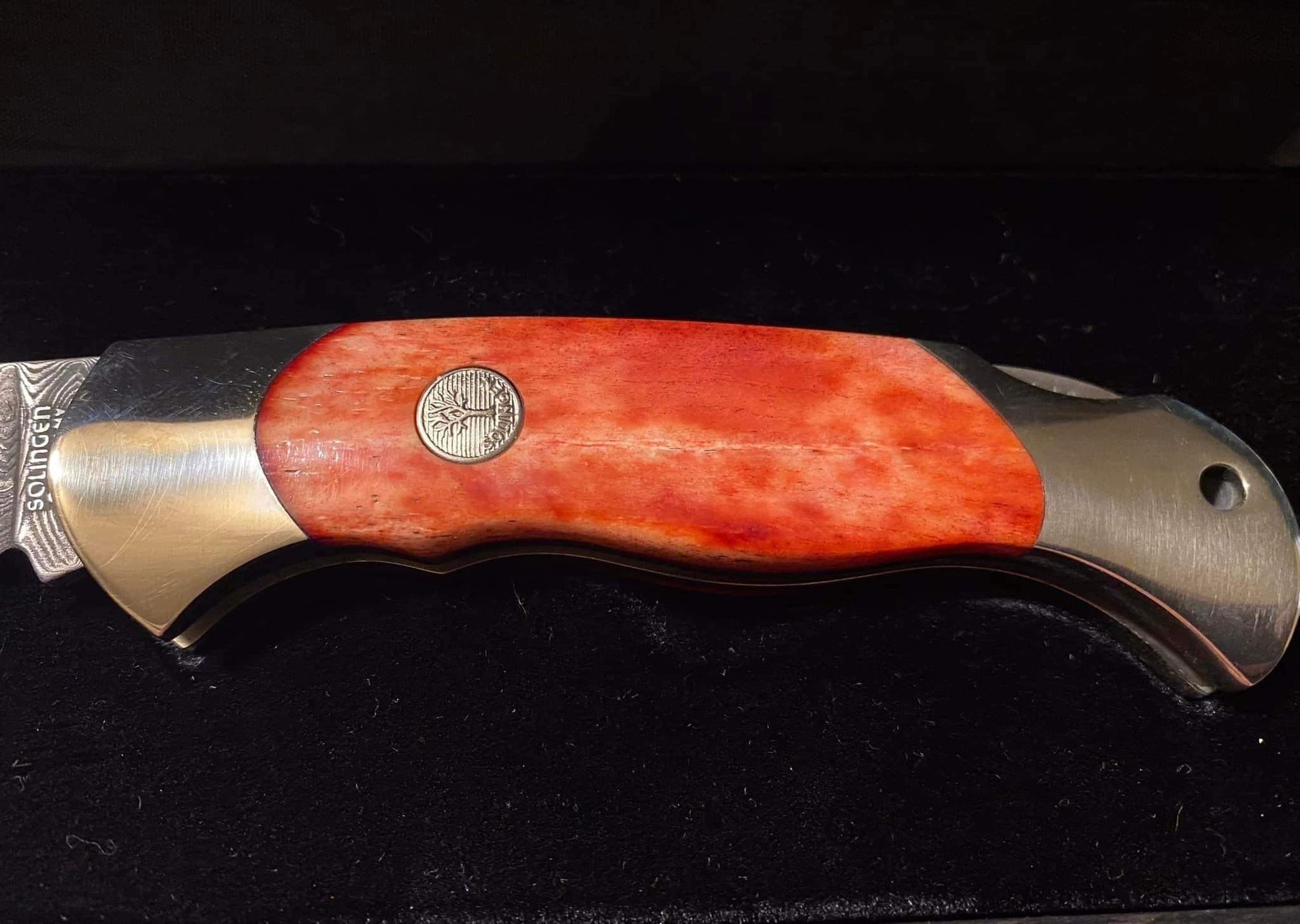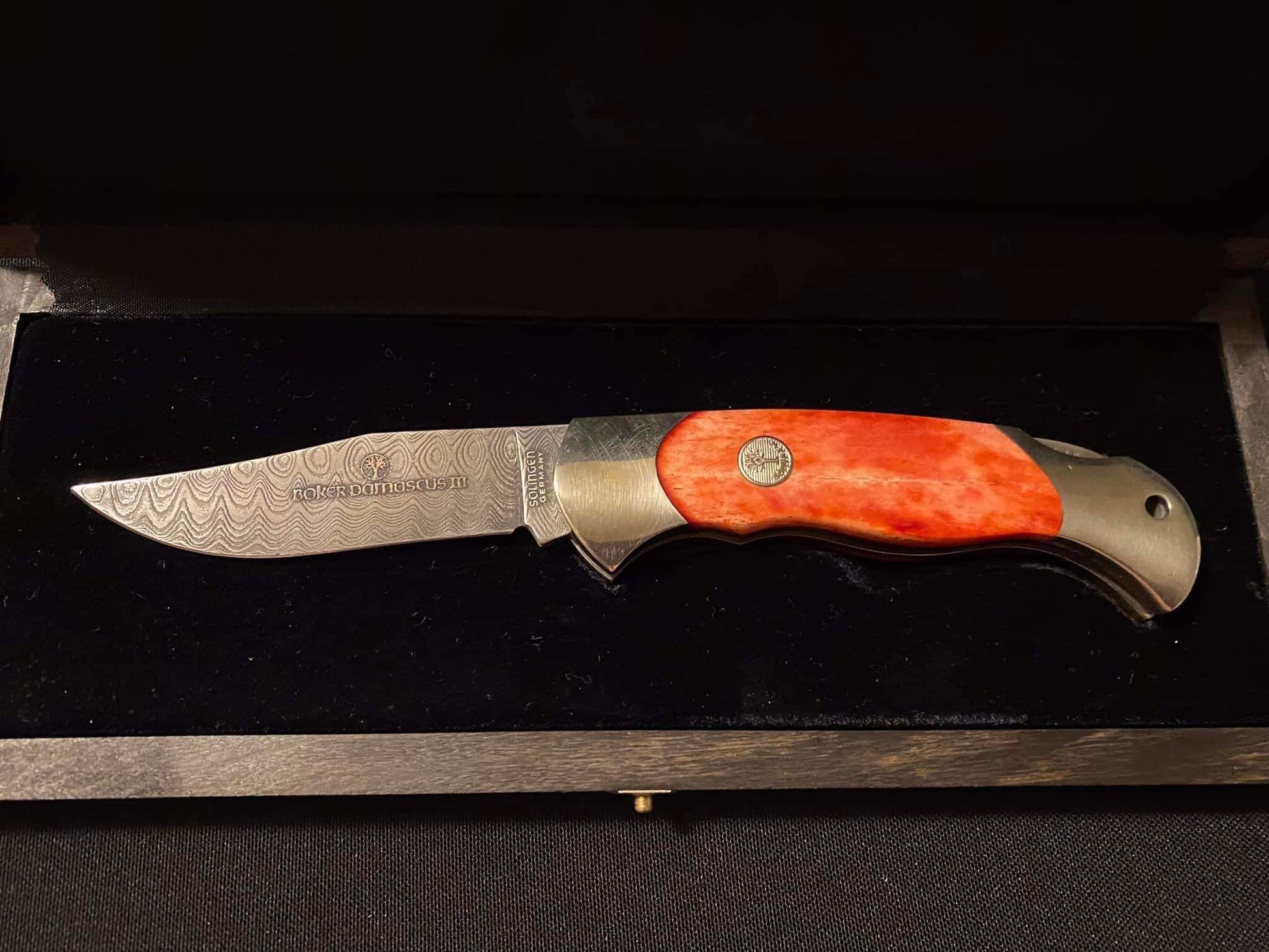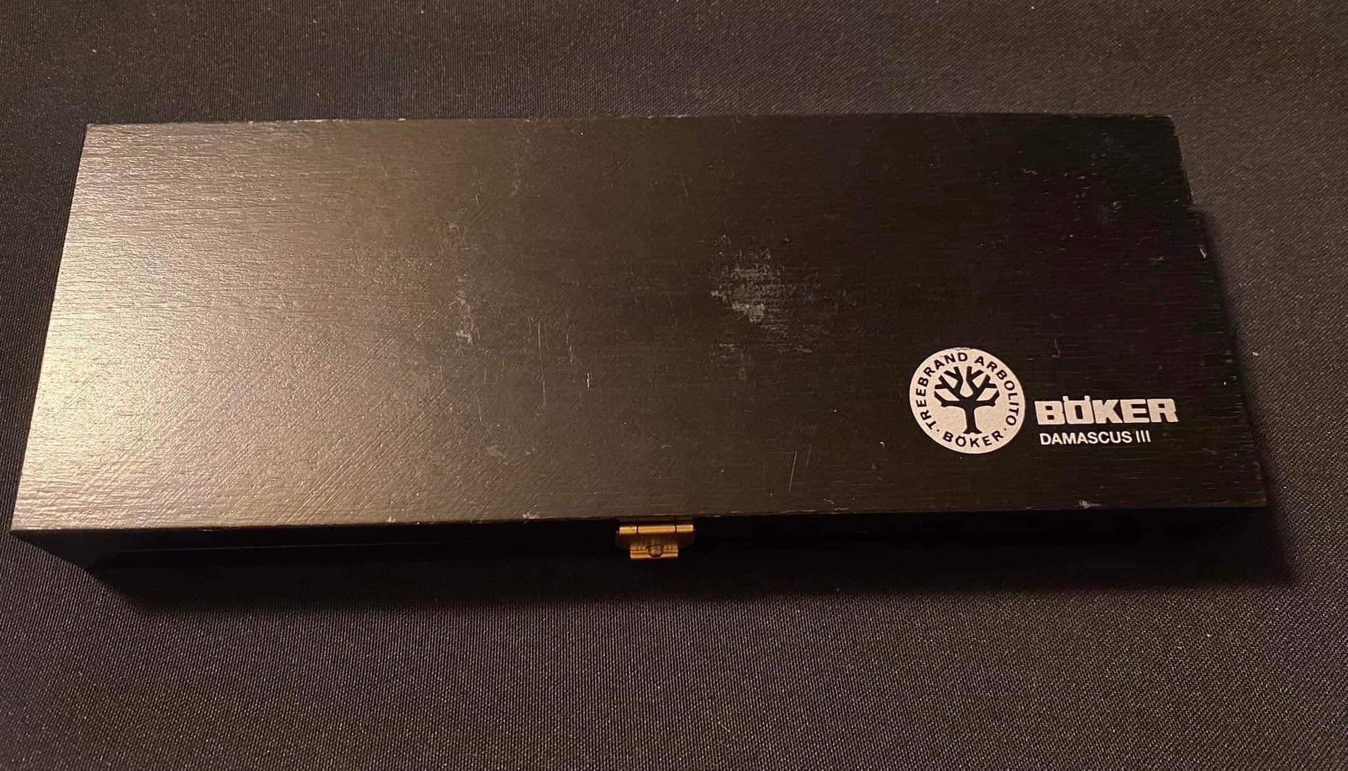 Navaja Böker Scout, Acero Damasco, Hecha en Solingen Alemania, 7.2 pulgadas largo total, cachas de hueso, nueva en caja de madera.