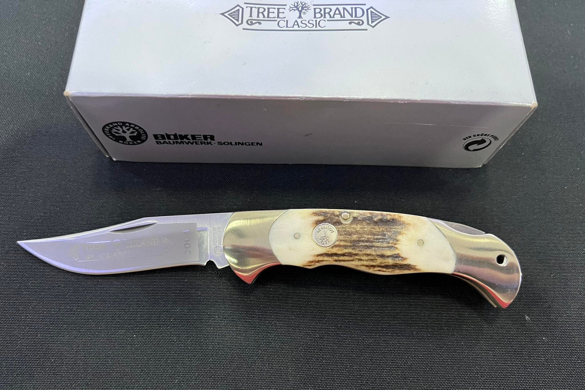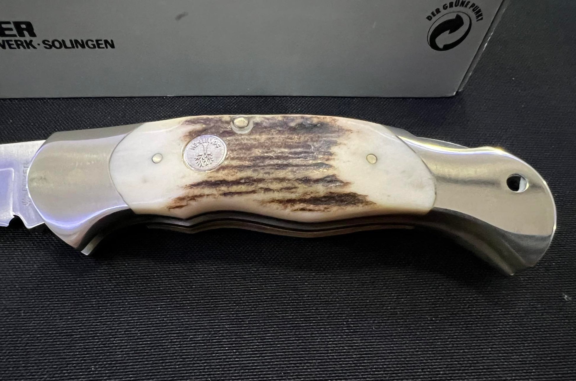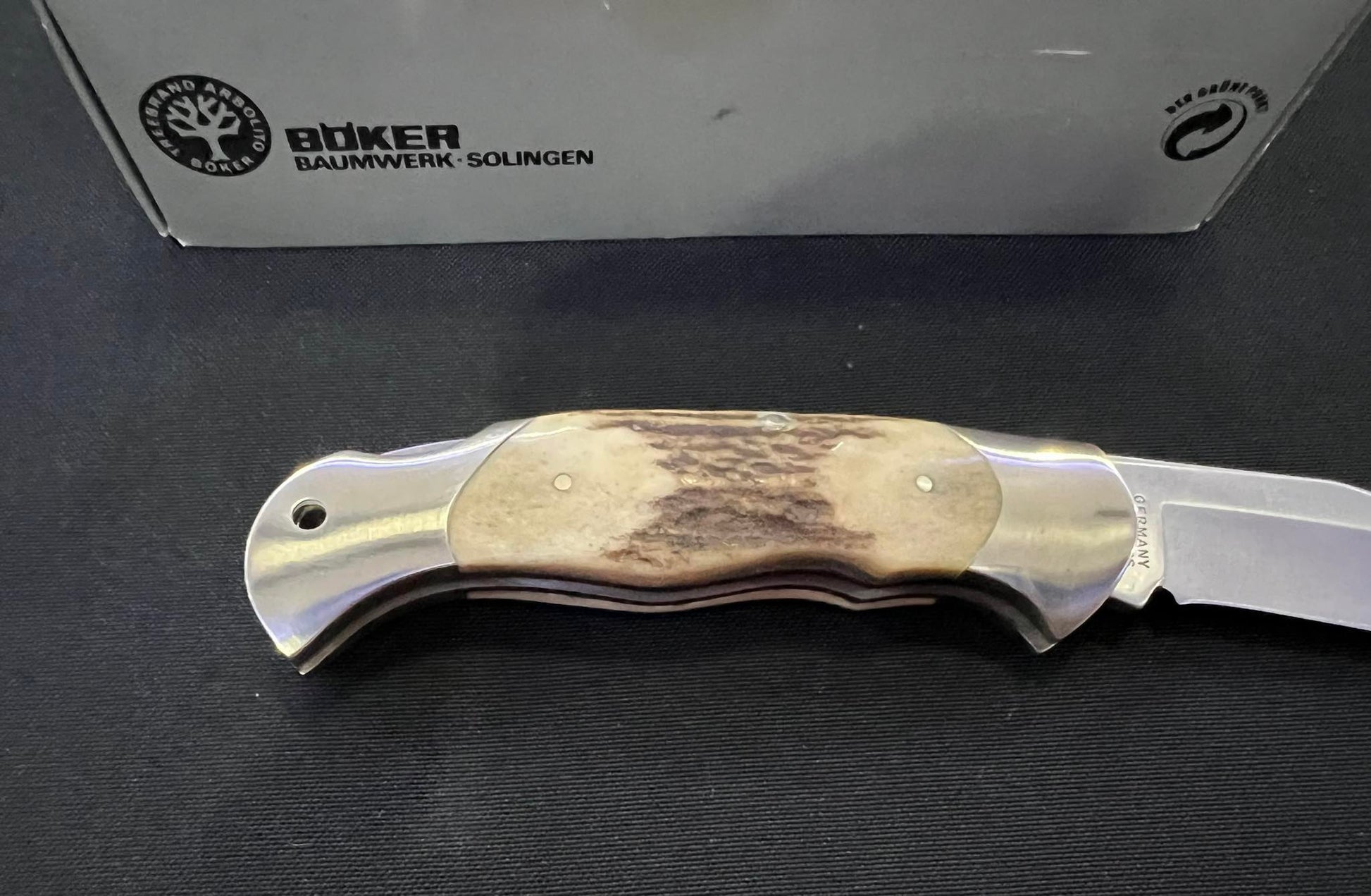 Navaja Böker Scout, 7.2 pulgadas largo total, Hecha en Solingen Alemania, Cachas de Asta de Ciervo, Acero Inoxidable, nueva en caja.