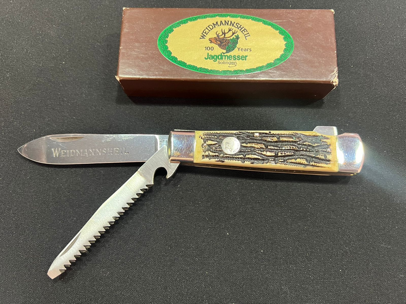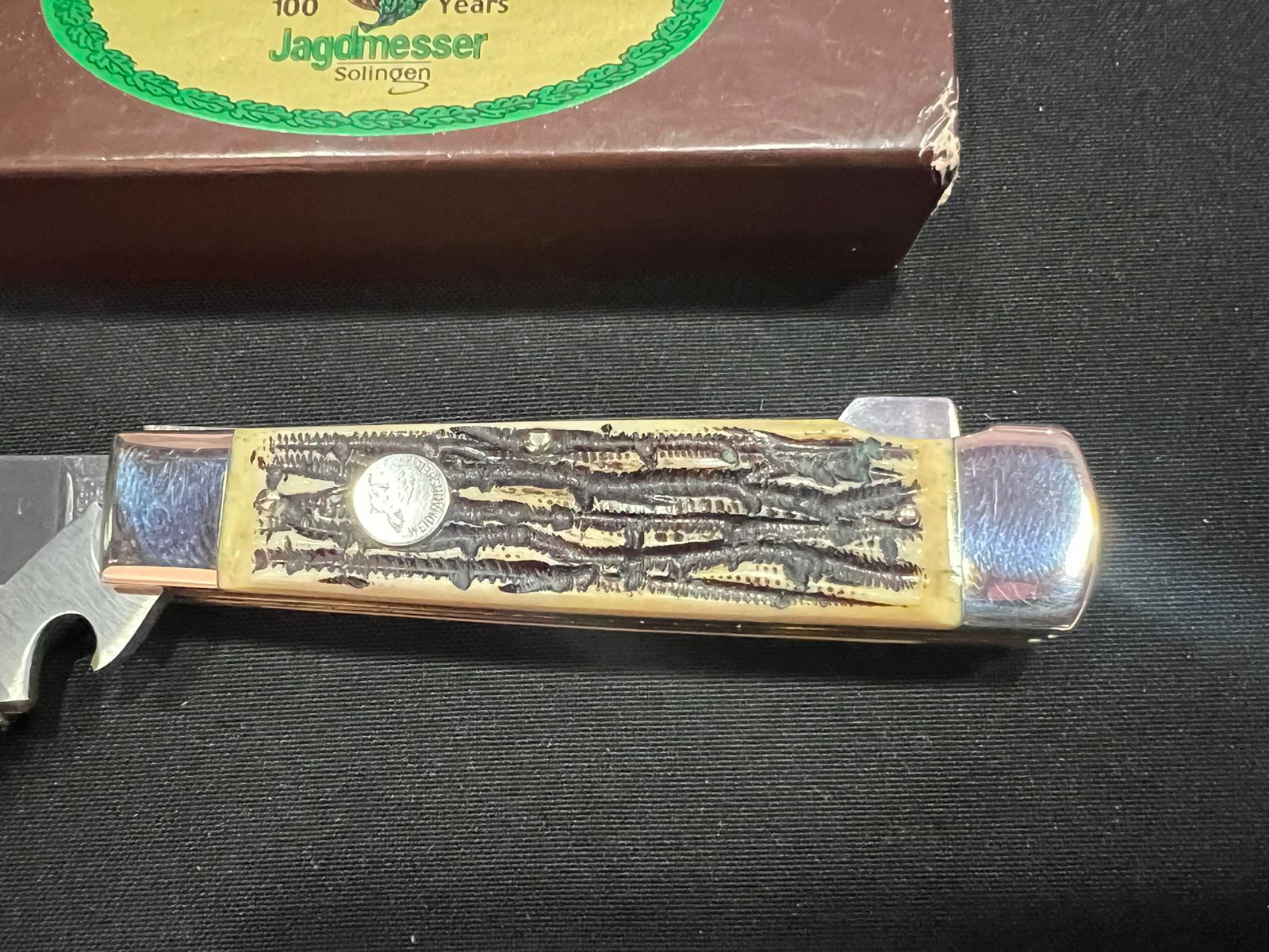 Navaja Weidmannsheil, 7.9 pulgadas largo total con hoja principal abierta, Cachas de Hueso, Acero Carbono, Hecha en Solingen Alemania.