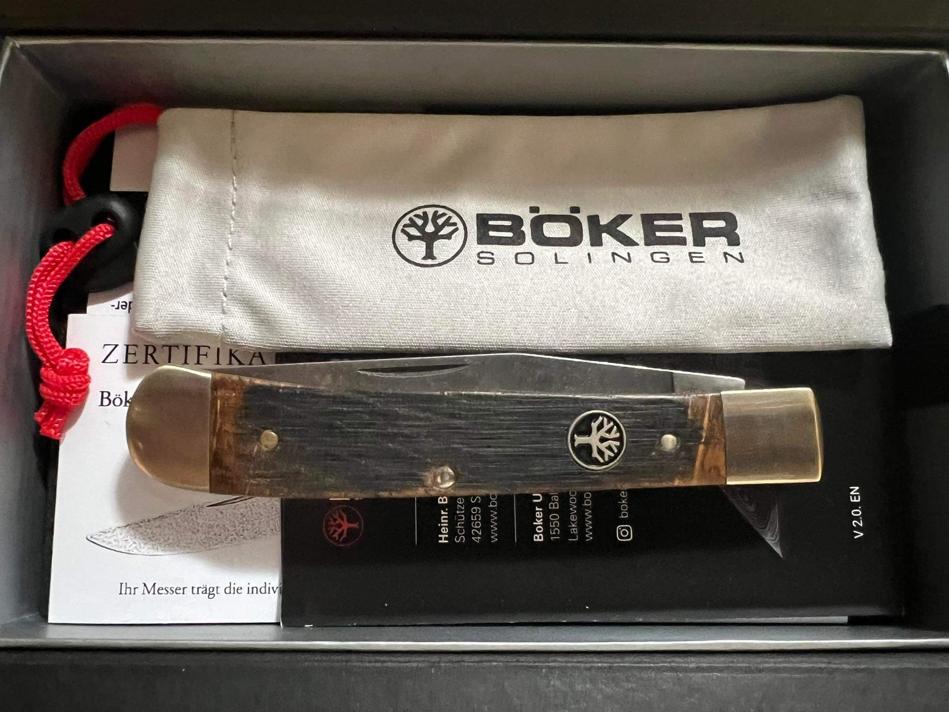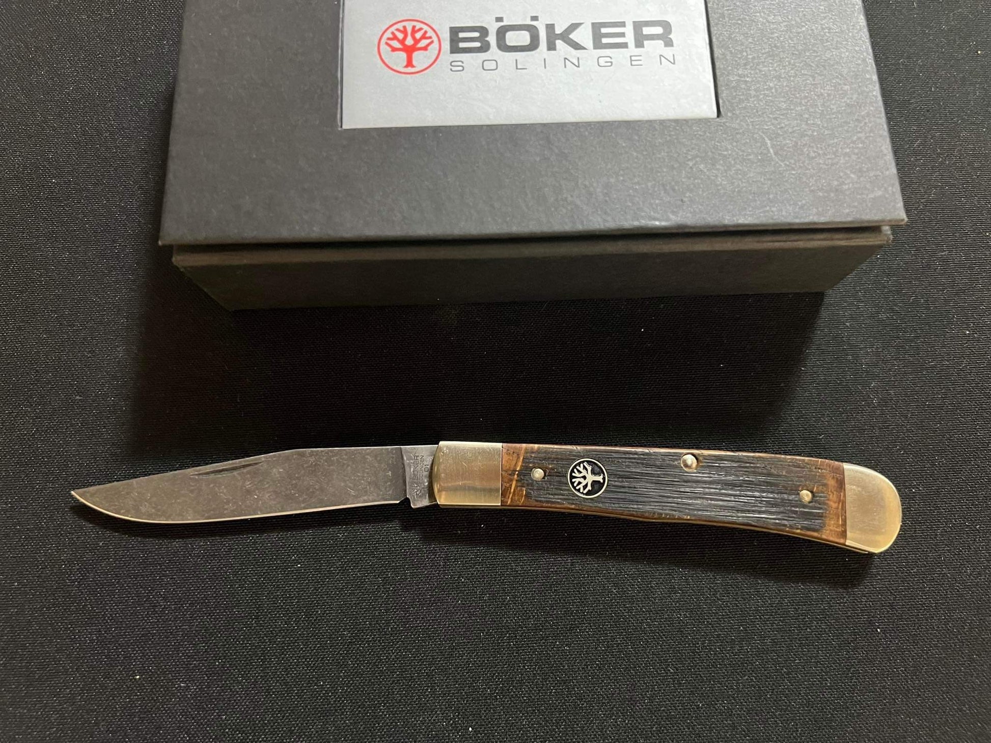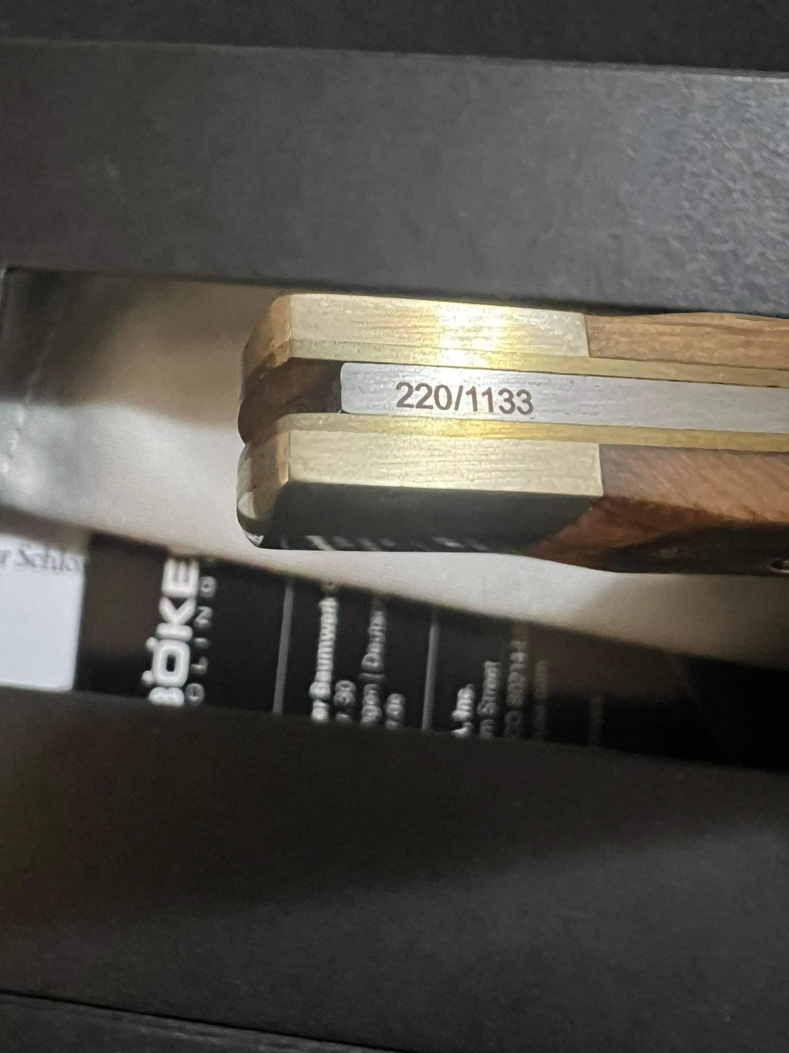 Navaja Böker Schloss Burg, las cachas estan hechas de tablones de madera de roble del Castillo Burg en Solingen Alemania, el cual se termino de construir en el año 1133, acero O1 bañado en acido, numero de serie 220 de 1133 unidades, 7.5 pulgadas largo total, nueva en caja.